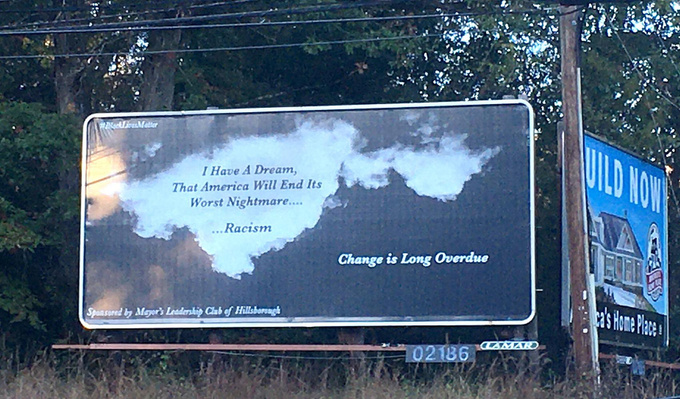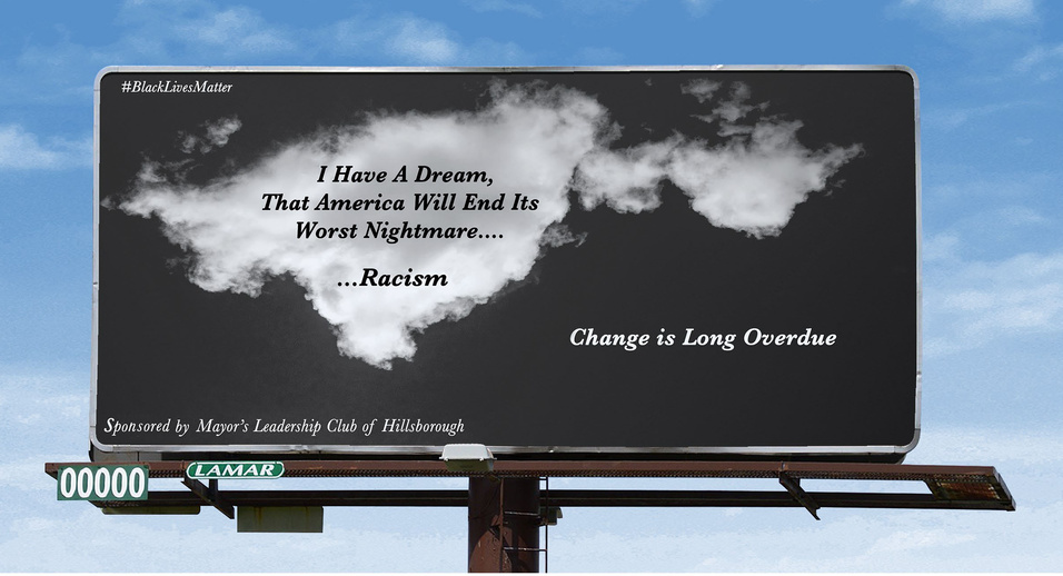 This Billboard was designed to bring the vision of youth in the Mayor's Leadership Club in Hillsborough to fruition. They wanted to take this opportunity to make a statement regarding the current state of our country and that they are actively fighting for change.